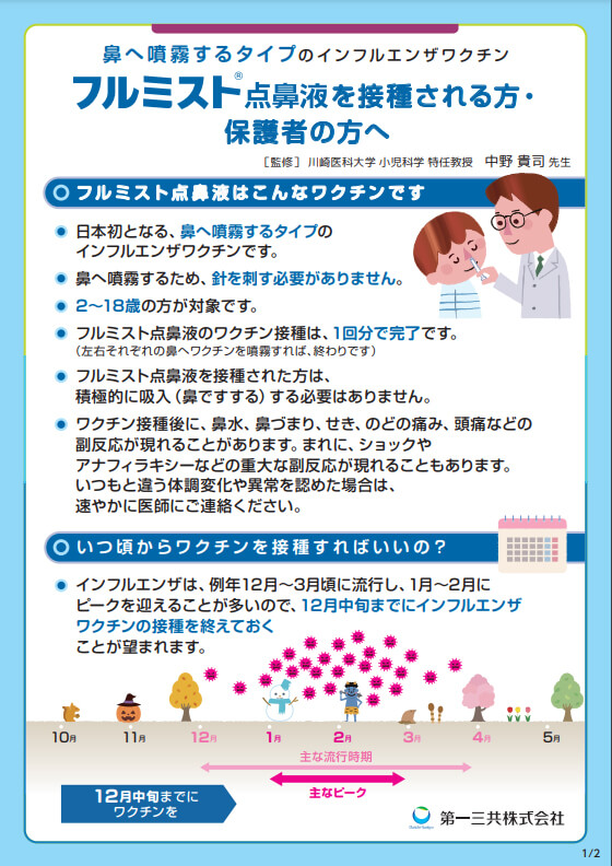 (小児用インフルエンザ)フルミスト点鼻液 7,700円 2歳~18歳※小児用インフルエンザワクチン 1回目 3500円 2回目 3300円